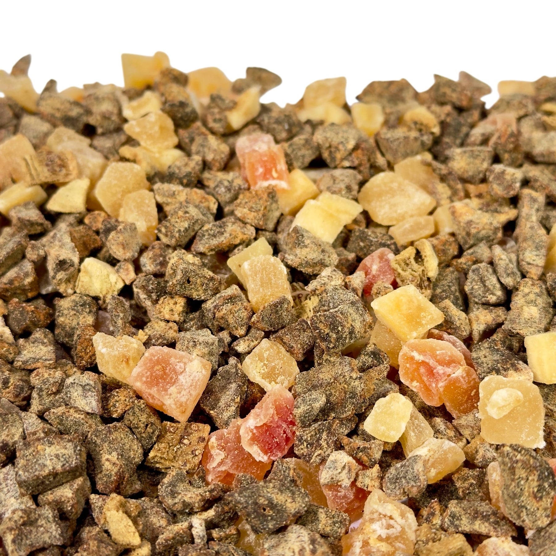 Ananasstücke verleihen eine exotische, fruchtige Süße und einen erfrischenden Charakter. Sie bringen eine natürliche Tropennote ins Getränk, die an Sommer und Sonne erinnert. Besonders in Kombination mit anderen Früchten oder Kräutern sorgen sie für eine lebendige und ausgewogene Geschmackskomposition.