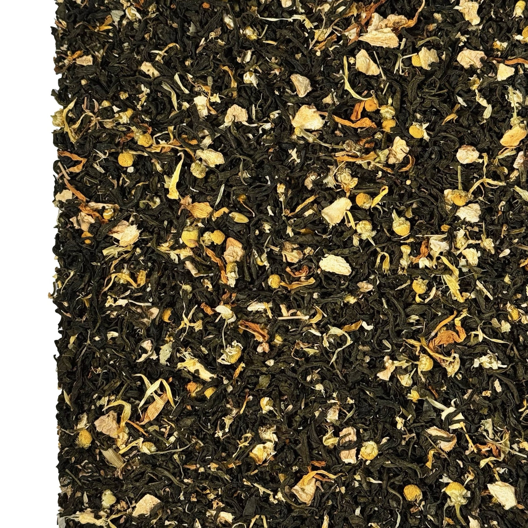 | Zutaten: | Grüner Tee China Wu Lu*, Ingwerstücke*, natürliches Frucht-Zitrus-Aroma, Kamillenblüten* (4%), Zitronenschalen* (2%), Lindenblüten*, Holunderblüten*, Ringelblumenblüten*, Sonnenblumenblüten*. * = aus kontrolliert biologischem Anbau |