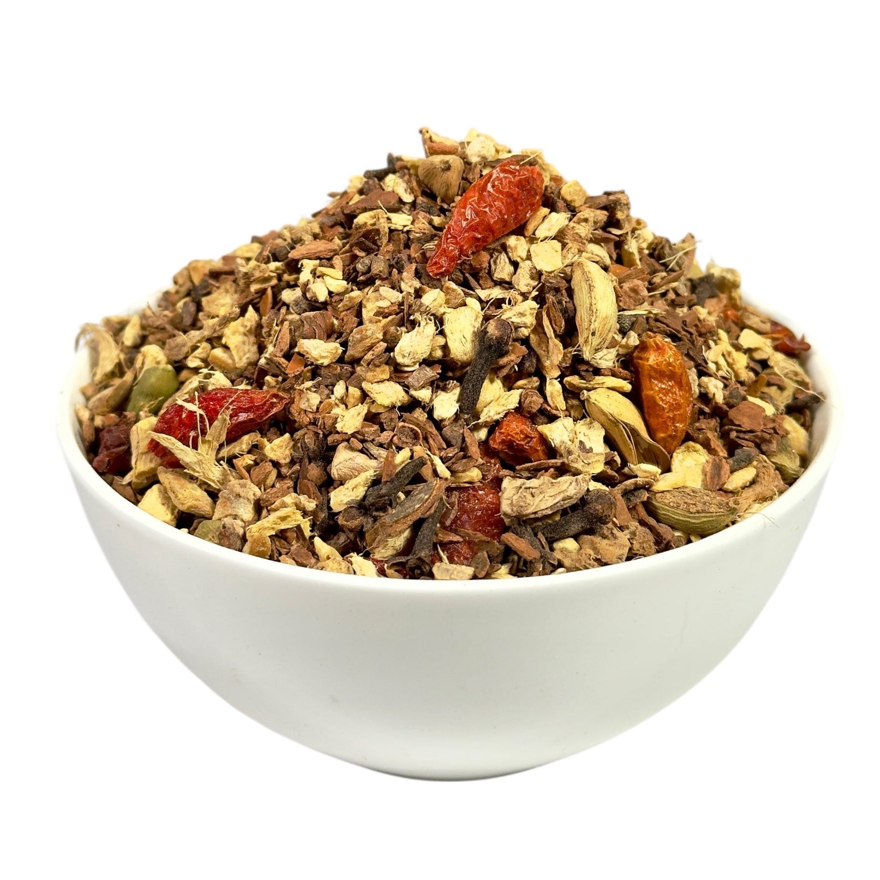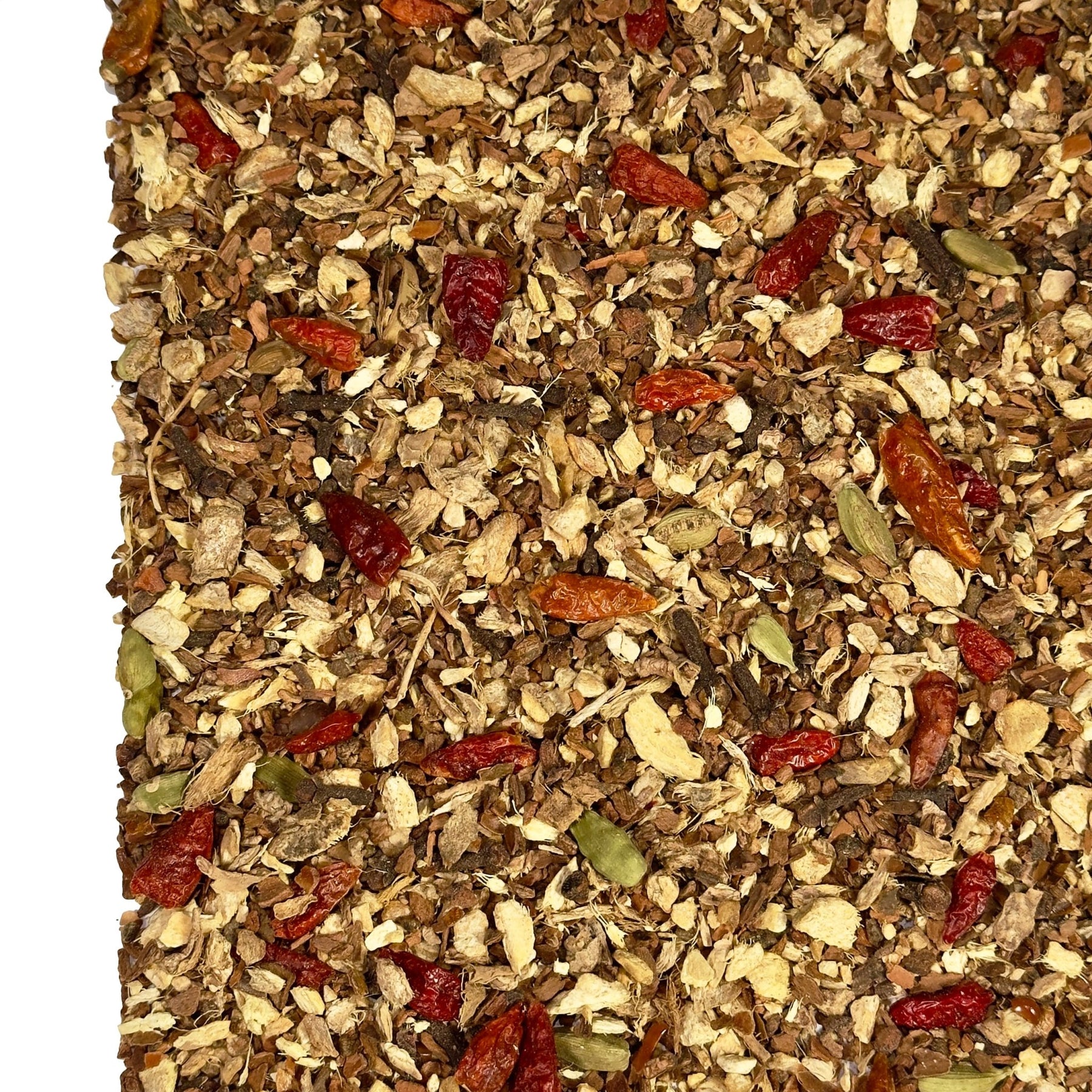 Die Chilischoten bringen eine aufregende, würzige Schärfe in den Tee, die für eine kleine Geschmacksexplosion sorgt. Ihre feurige Note ergänzt sich perfekt mit den anderen Aromen und schafft eine interessante Balance. Die Schärfe bleibt dezent im Hintergrund, sodass der Tee gleichzeitig angenehm und spannend bleibt. Ein bisschen Chili sorgt für das gewisse Extra und macht jede Tasse zu einem echten Abenteuer für den Gaumen.