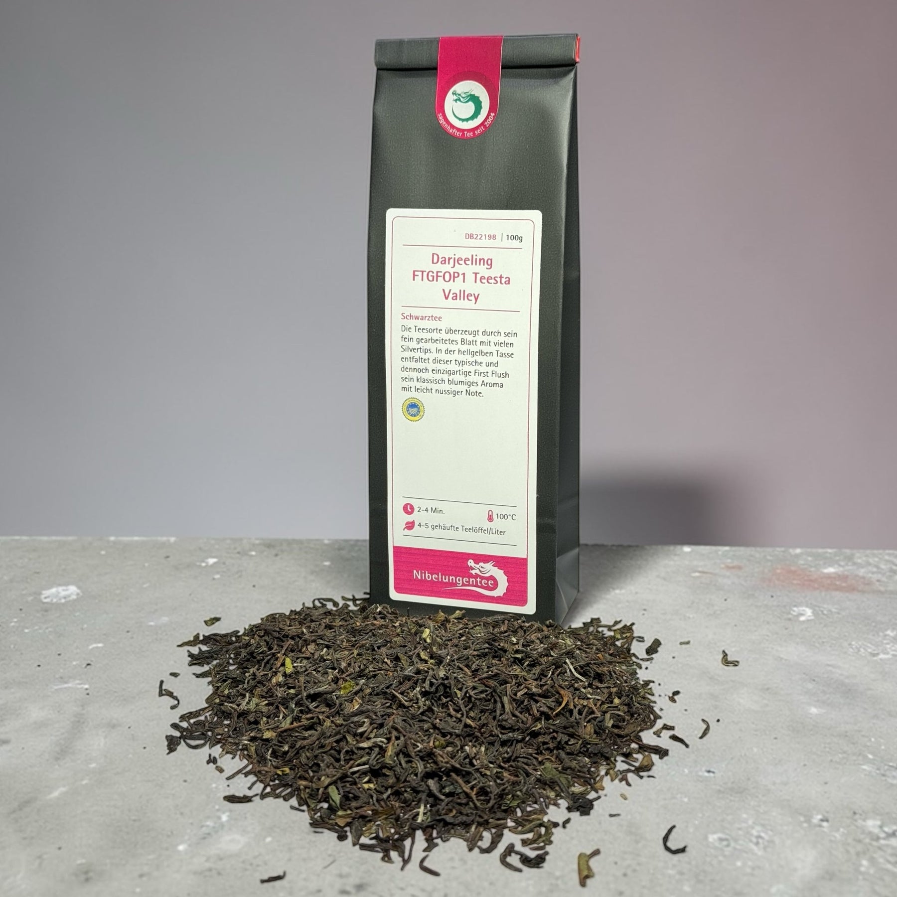 FTGFOP1 („Finest Tippy Golden Flowery Orange Pekoe 1“) ist eine der höchsten Blattgradierungen für Darjeeling-Tee. Sie steht für besonders feine, ganze Teeblätter mit einem hohen Anteil an jungen Knospen („Tips“), was dem Tee ein edles Aroma und eine ausgeprägte Geschmacksfülle verleiht. Darjeeling-Tees mit dieser Einstufung sind oft besonders blumig, leicht und elegant im Geschmack.