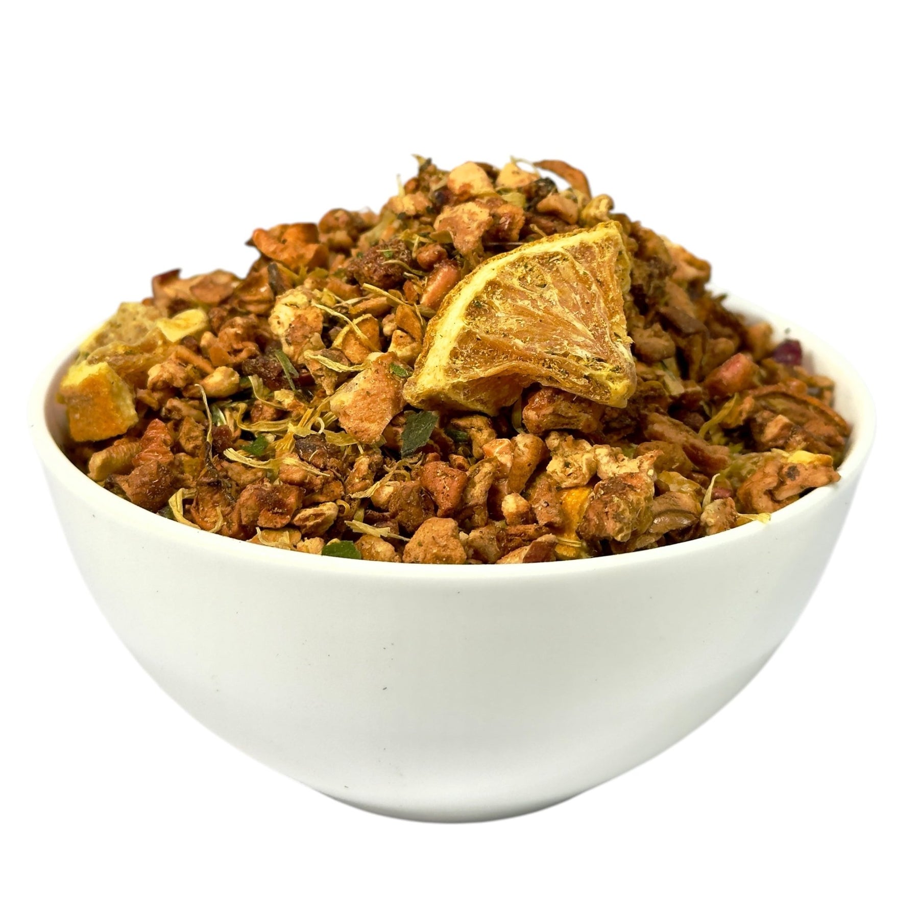 Wenn der Duft von sonnengereiften Apfelsinen aufsteigt, ist es fast so, als würde man einen kleinen Urlaubsschub in der Tasse erleben. Dieser Tee bringt die pure Fruchtigkeit von Orangen und anderen ausgewählten Zutaten zusammen und lässt dich für einen Moment den Alltag vergessen. Ob grauer Morgen oder gemütlicher Nachmittag – hier wartet ein fruchtiger Seelenschmeichler auf dich.