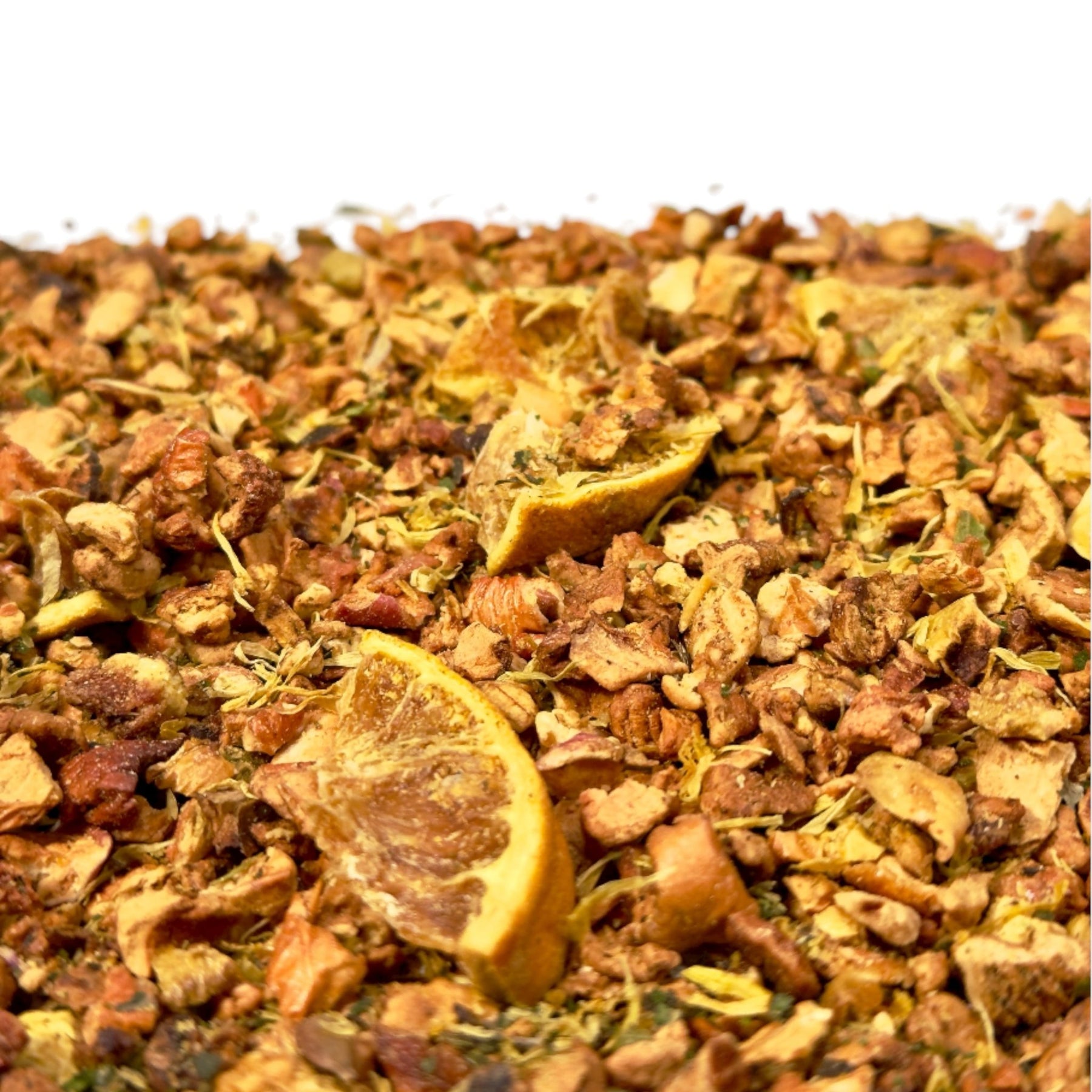 Zutaten: | Apfelstücke, Orangenspalten, natürliches Aroma, gefr.-getr. Mandarinorangenstücke, Ringelblumenblüten, Walderdbeerblätter |