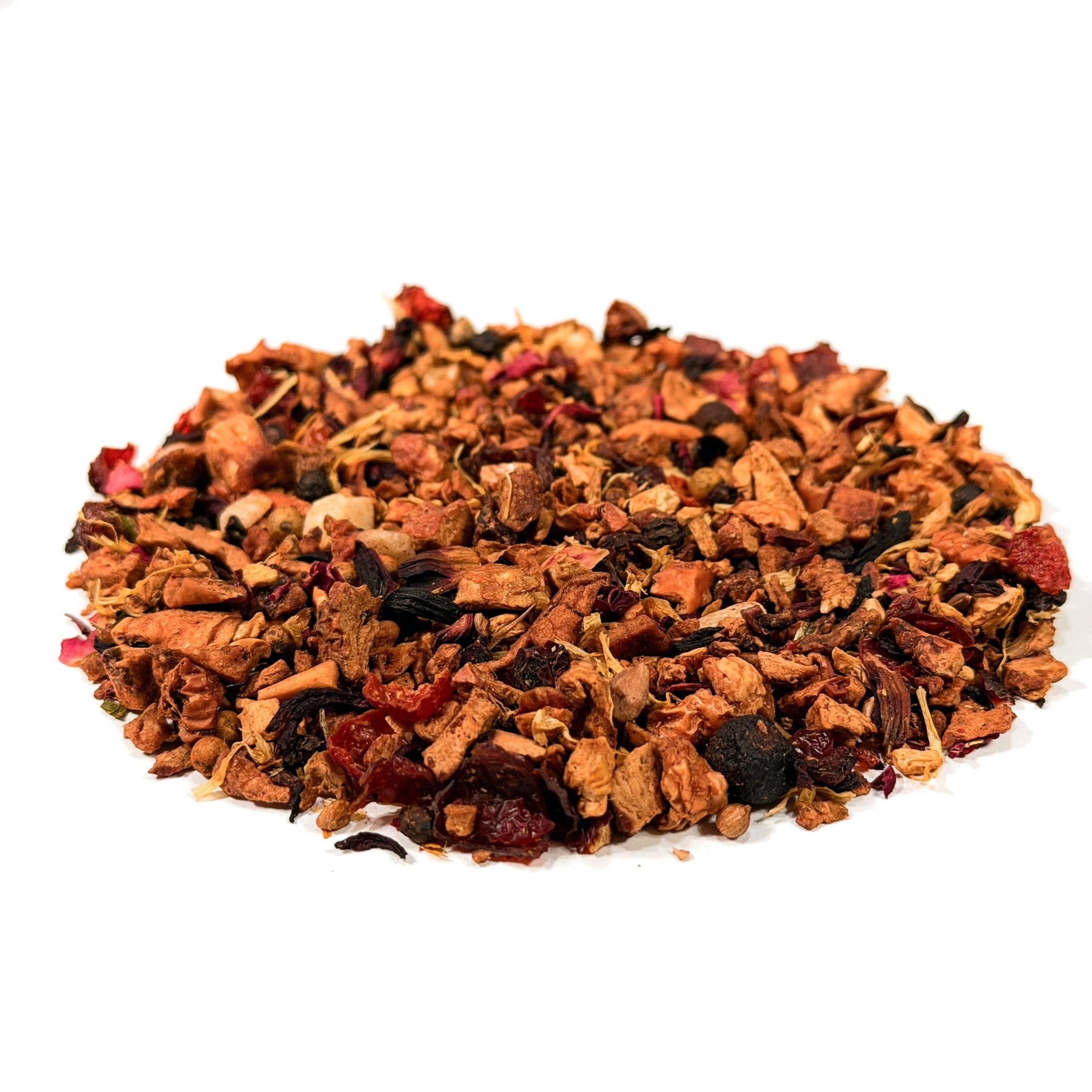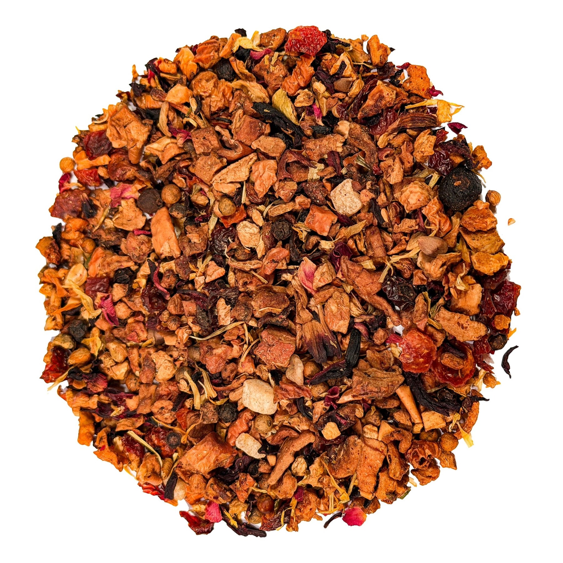 Freche Noten spielen die Pfefferkörner ein, während Apfelstücke, Honigmelonenwürfel und Hagebuttenschalen beruhigend auf das Ganze einwirken. Feine Rosen-, Hibiskus- und Orangenblüten sorgen für eine schicke Optik sowie einen feinen Dufthauch, der dieser ausgewogenen Komposition erst die perfekte Harmonie beschert.