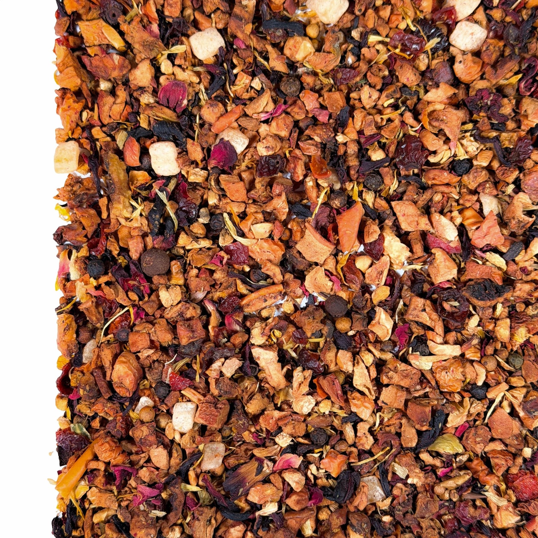 Zutaten: Apfelstücke, Hibiskusblüten, Hagebuttenschalen, Ingwerstücke, bunte Pfefferkörner, Aroma, Honigmelonenwürfel (Honigmelone, Zucker, Fruktose-Sirup), Rosenblüten, Ringelblumen
