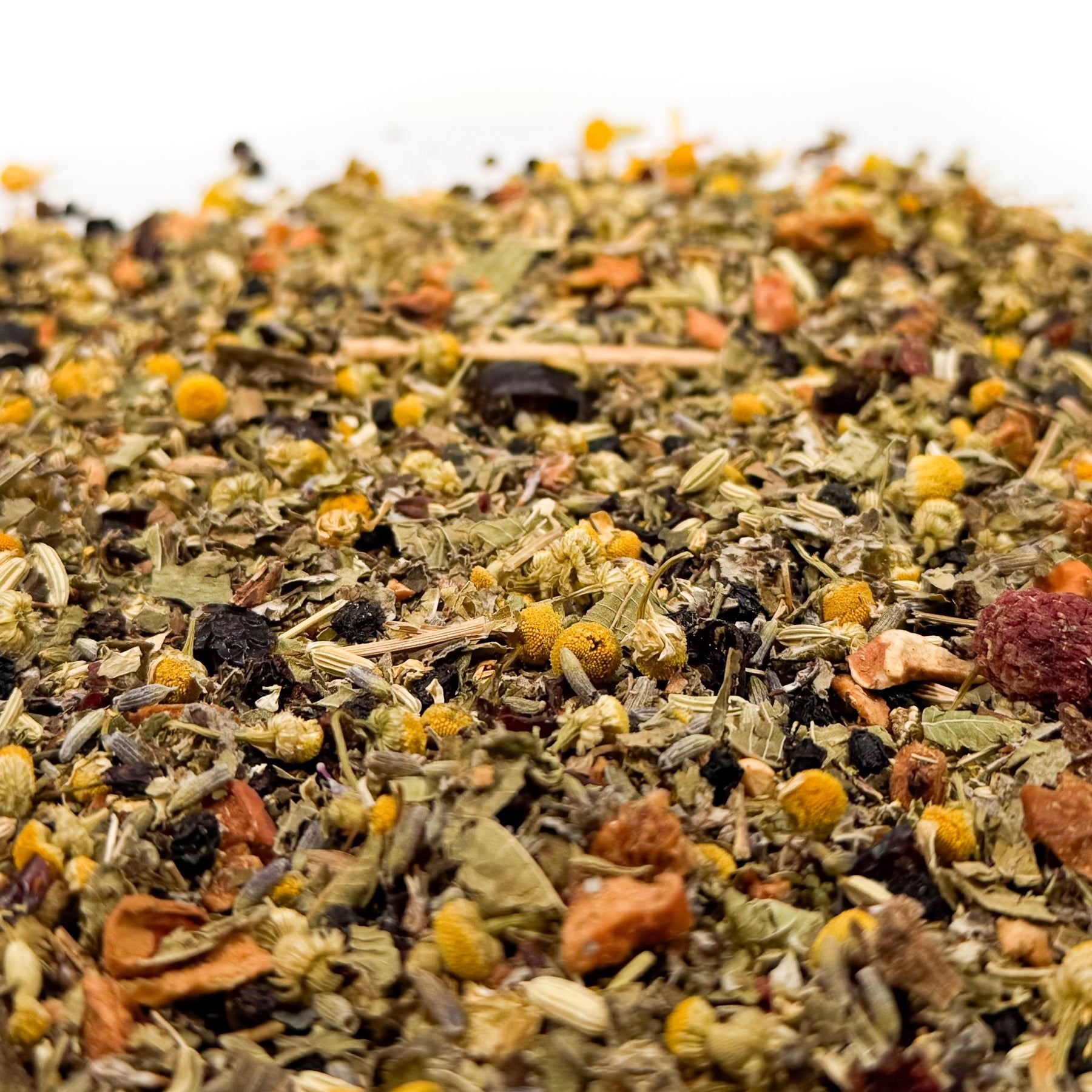 Angereichert mit ganzen Himbeeren, lila Lavendelblüten, Zitronenverbene, Kamille und Fenchel verspricht diese Kräutermischung schon beim Öffnen der Tüte wahre Vielfalt.