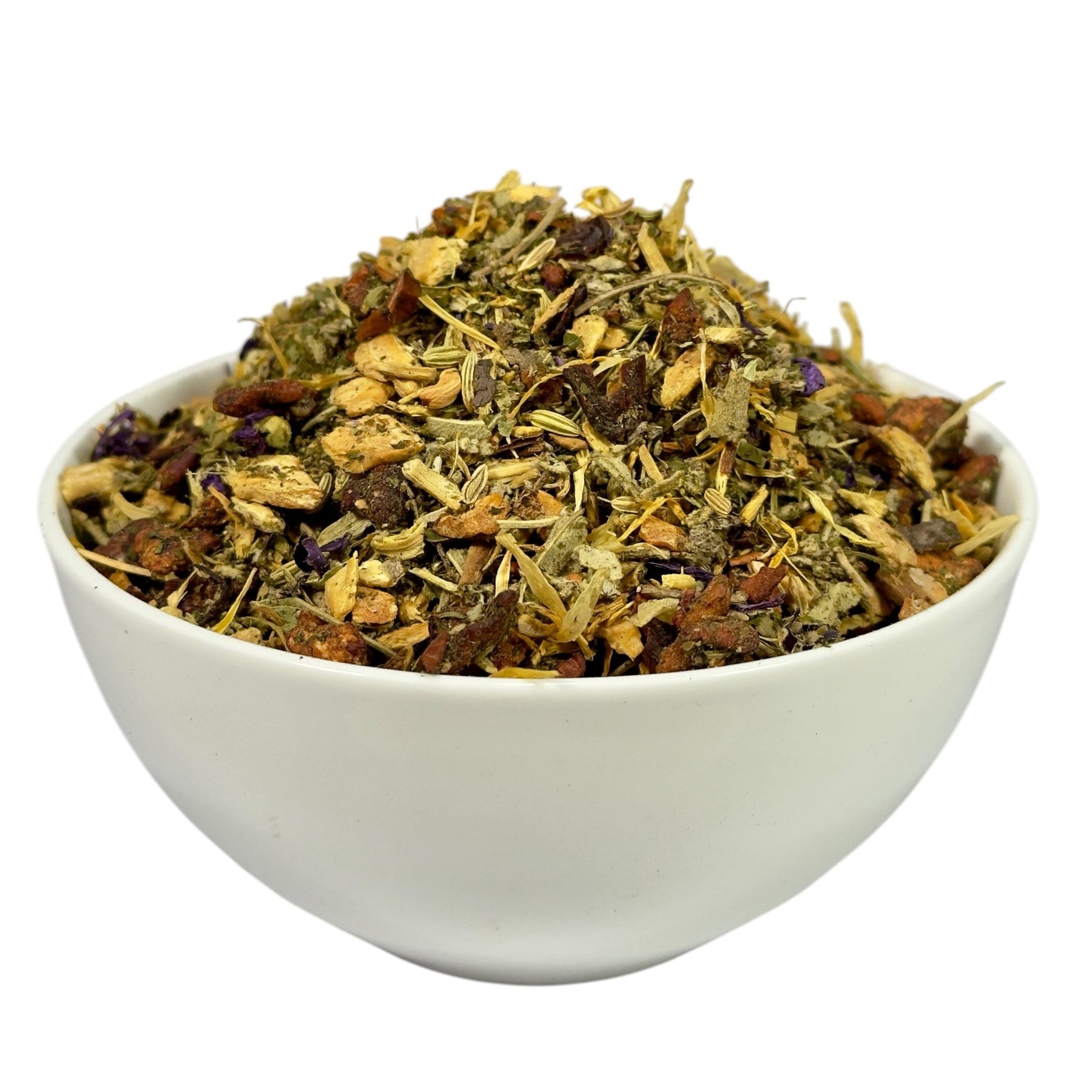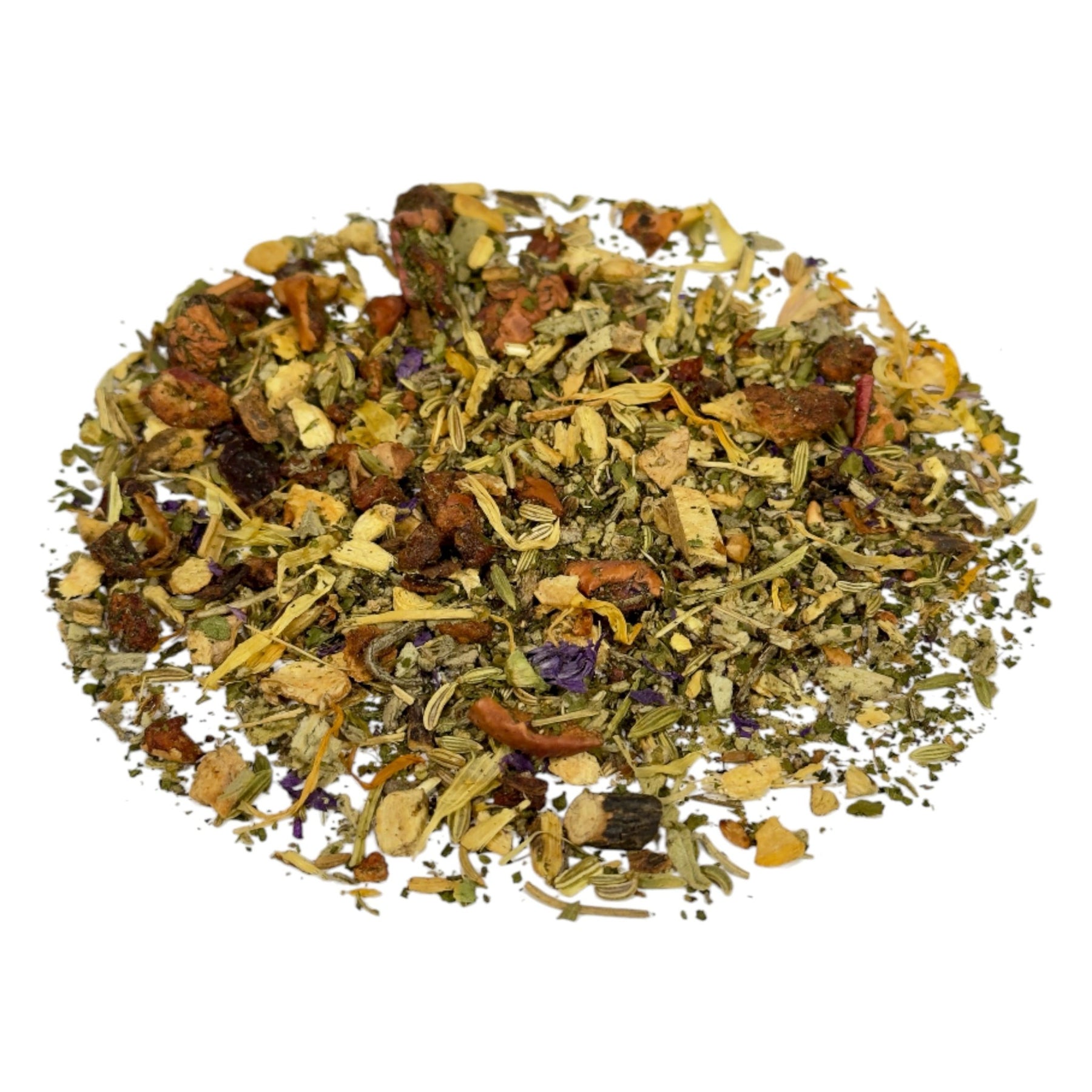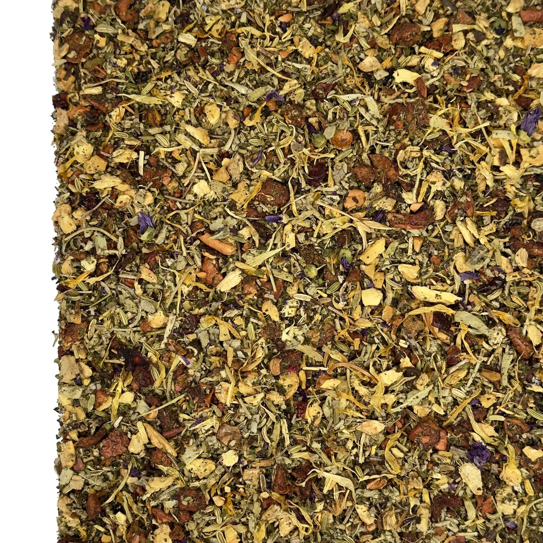 | Zutaten: | Apfelstücke (Apfel, Säuerungsmittel: Zitronensäure), Ingwerstücke, SÜSSHOLZWURZEL, Fenchel, Salbeiblätter (10%), Hagebuttenschalen, Brennnesselblätter, natürliches Aroma, Manukahonig (2,5%), Malvenblüten, Ringelblumenblüten |