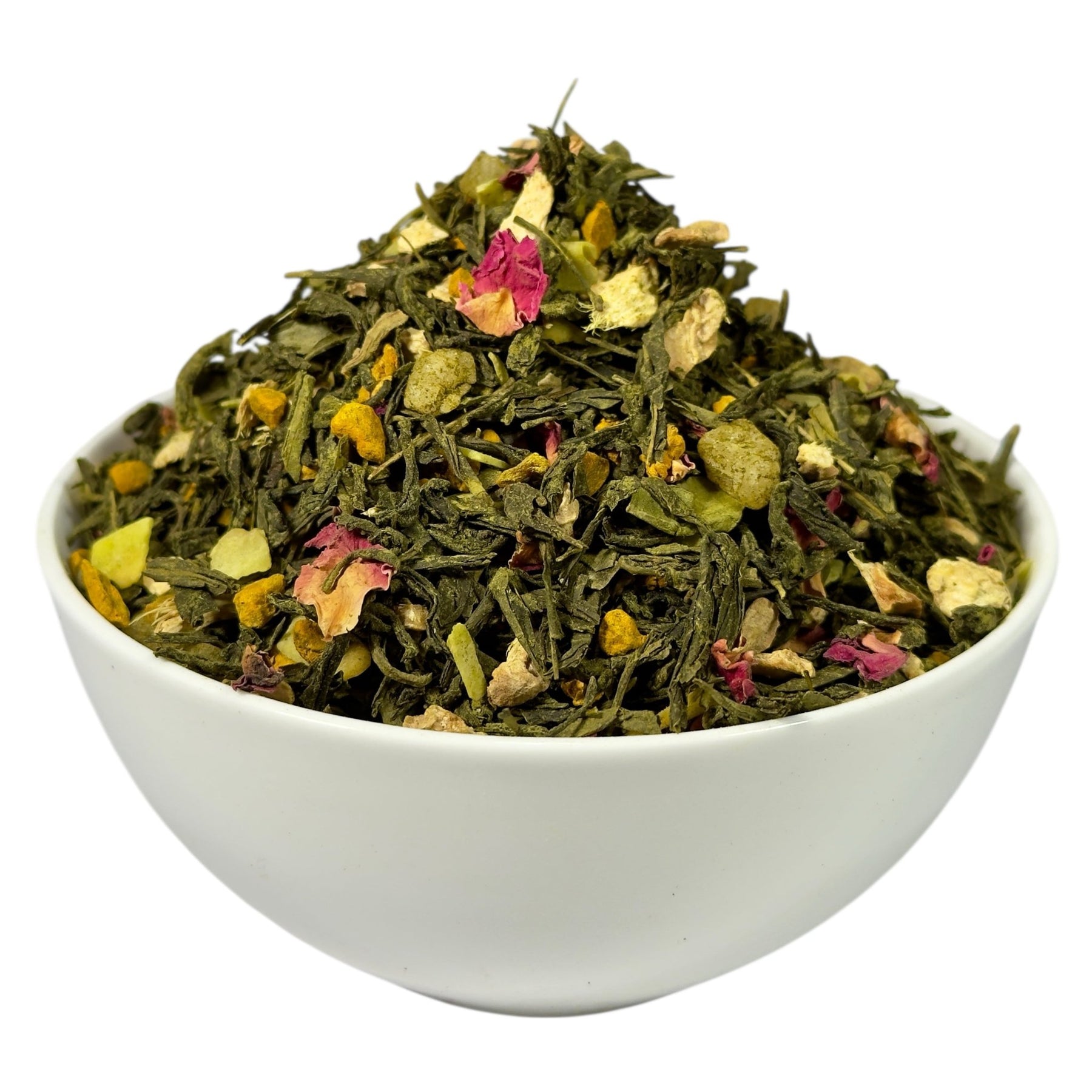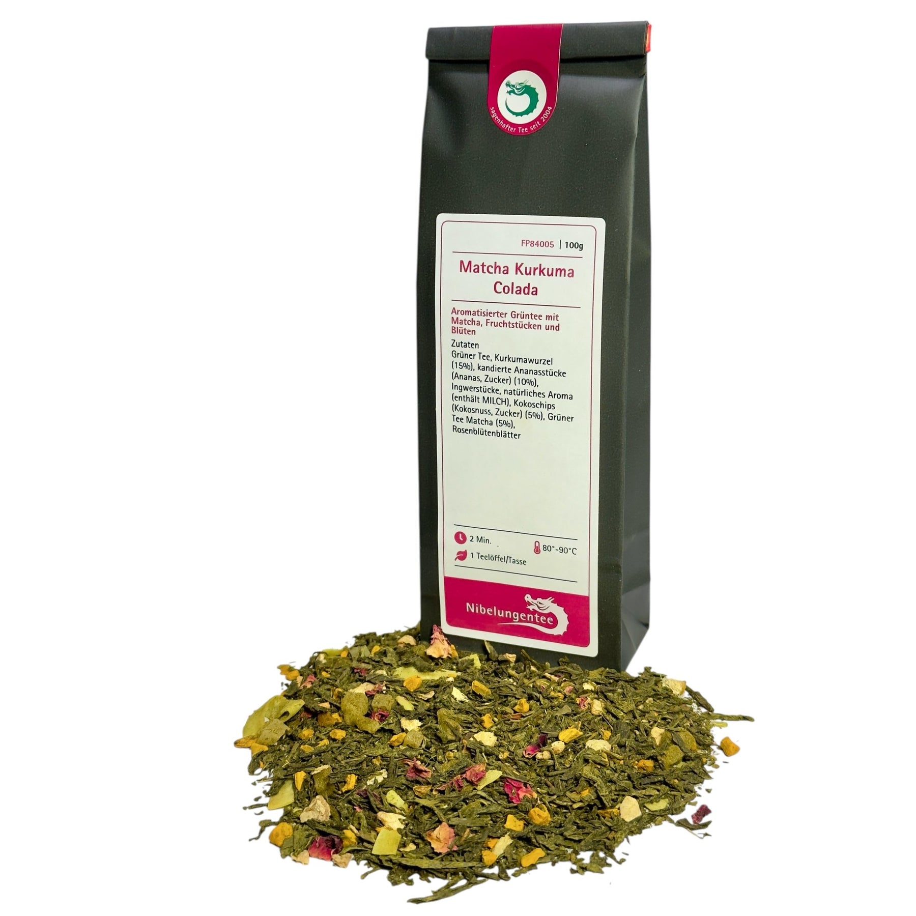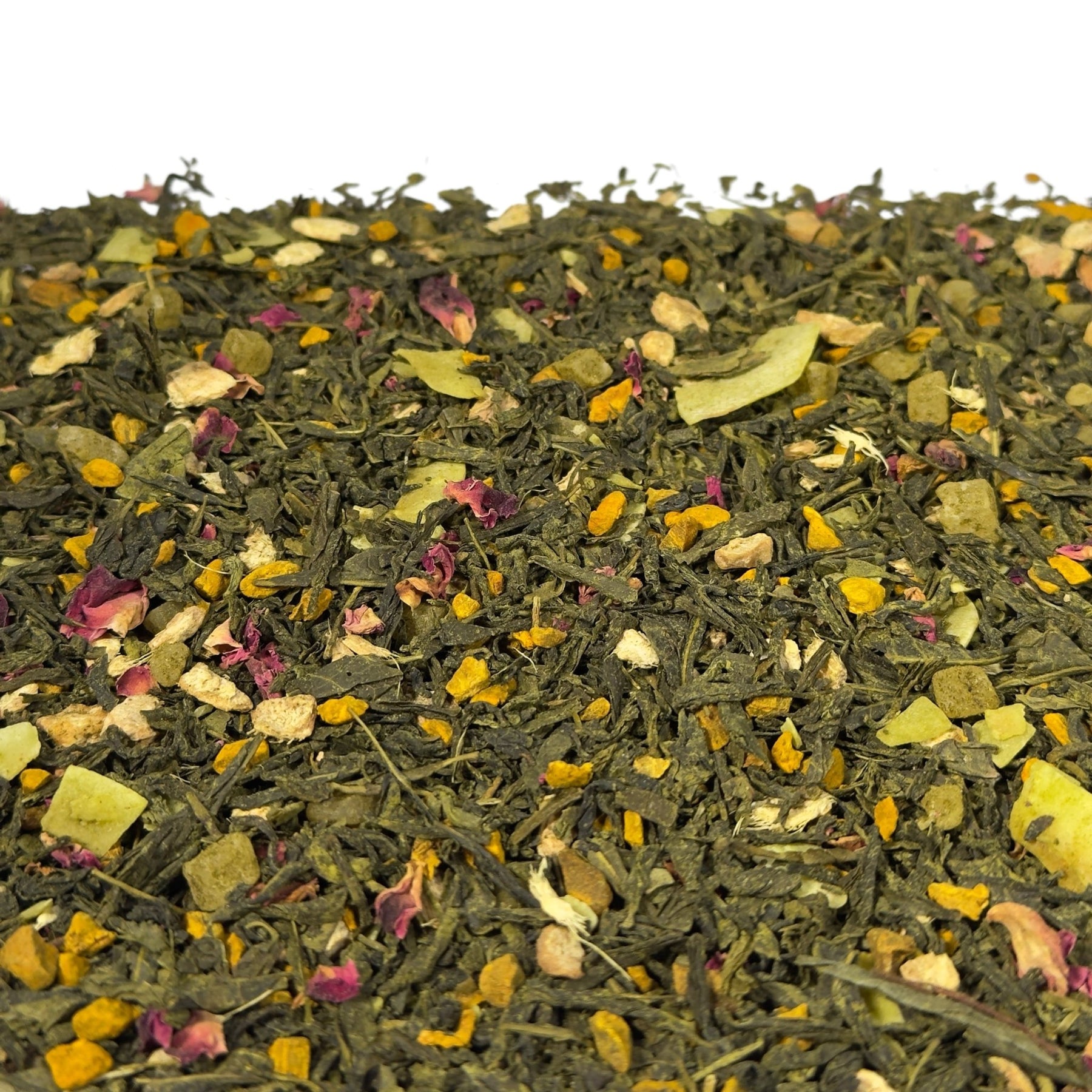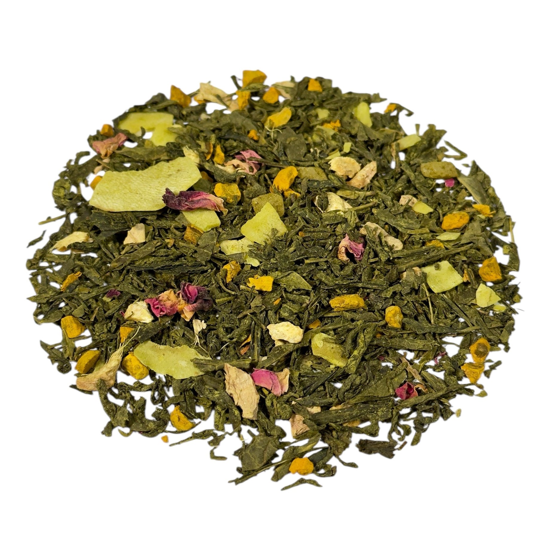 | Zutaten: | Grüner Tee, Kurkumawurzel (15%), kandierte Ananasstücke (Ananas, Zucker) (10%), Ingwerstücke, natürliches Aroma (enthält MILCH), Kokoschips (Kokosnuss, Zucker) (5%), Grüner Tee Matcha (5%), Rosenblütenblätter |
