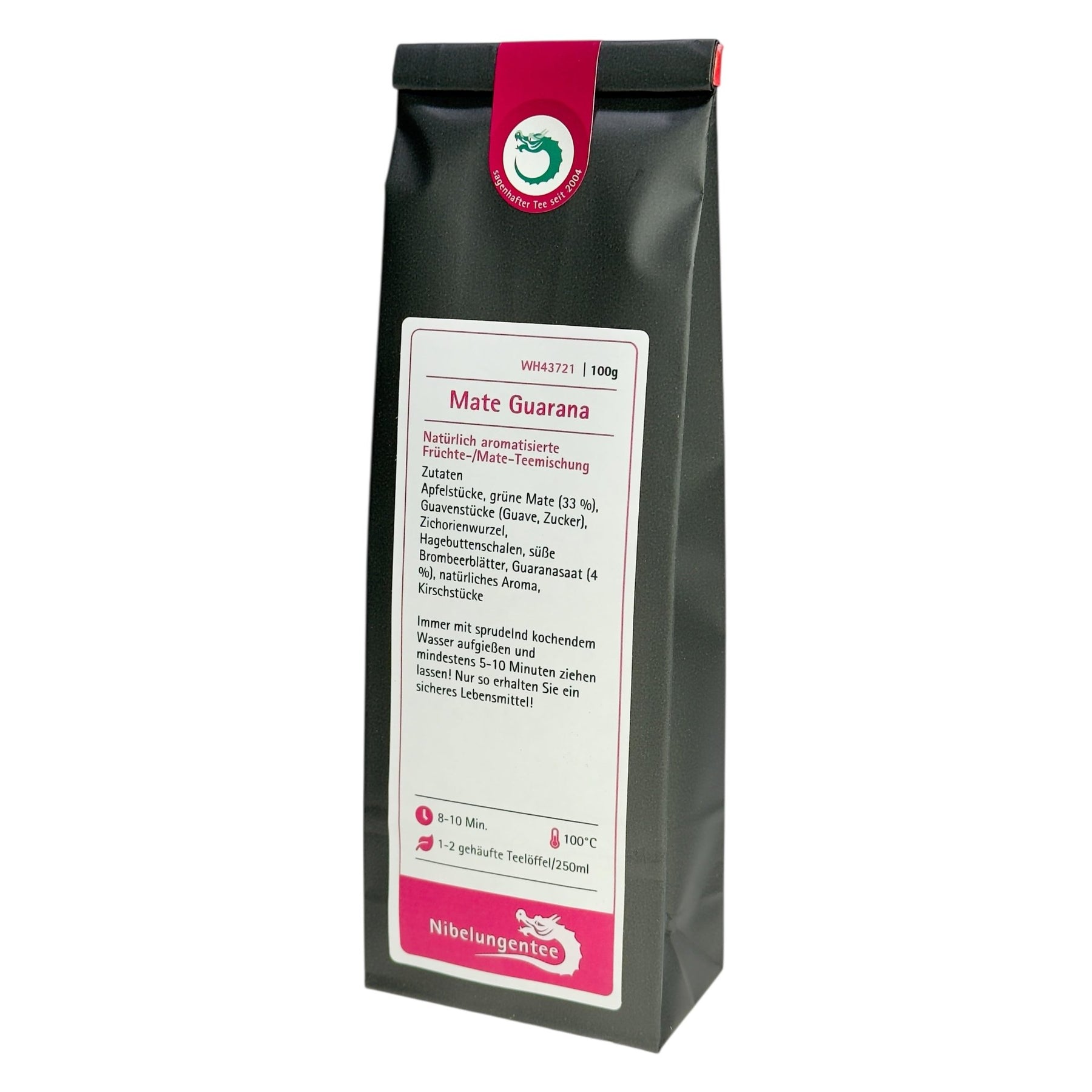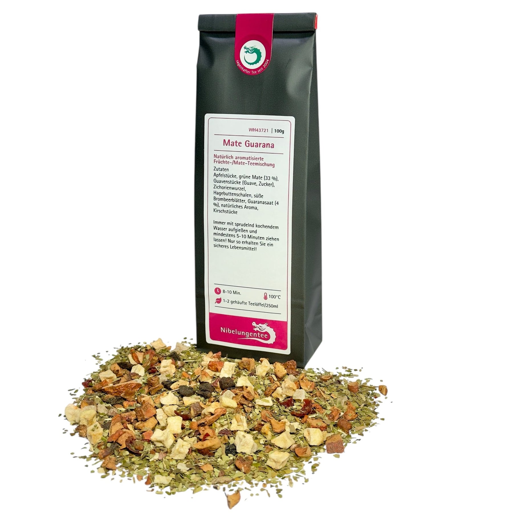 | Zutaten: | Apfelstücke, grüne Mate (33 %), Guavenstücke (Guave, Zucker), Zichorienwurzel, Hagebuttenschalen, süße Brombeerblätter, Guaranasaat (4 %), natürliches Aroma, Kirschstücke |
