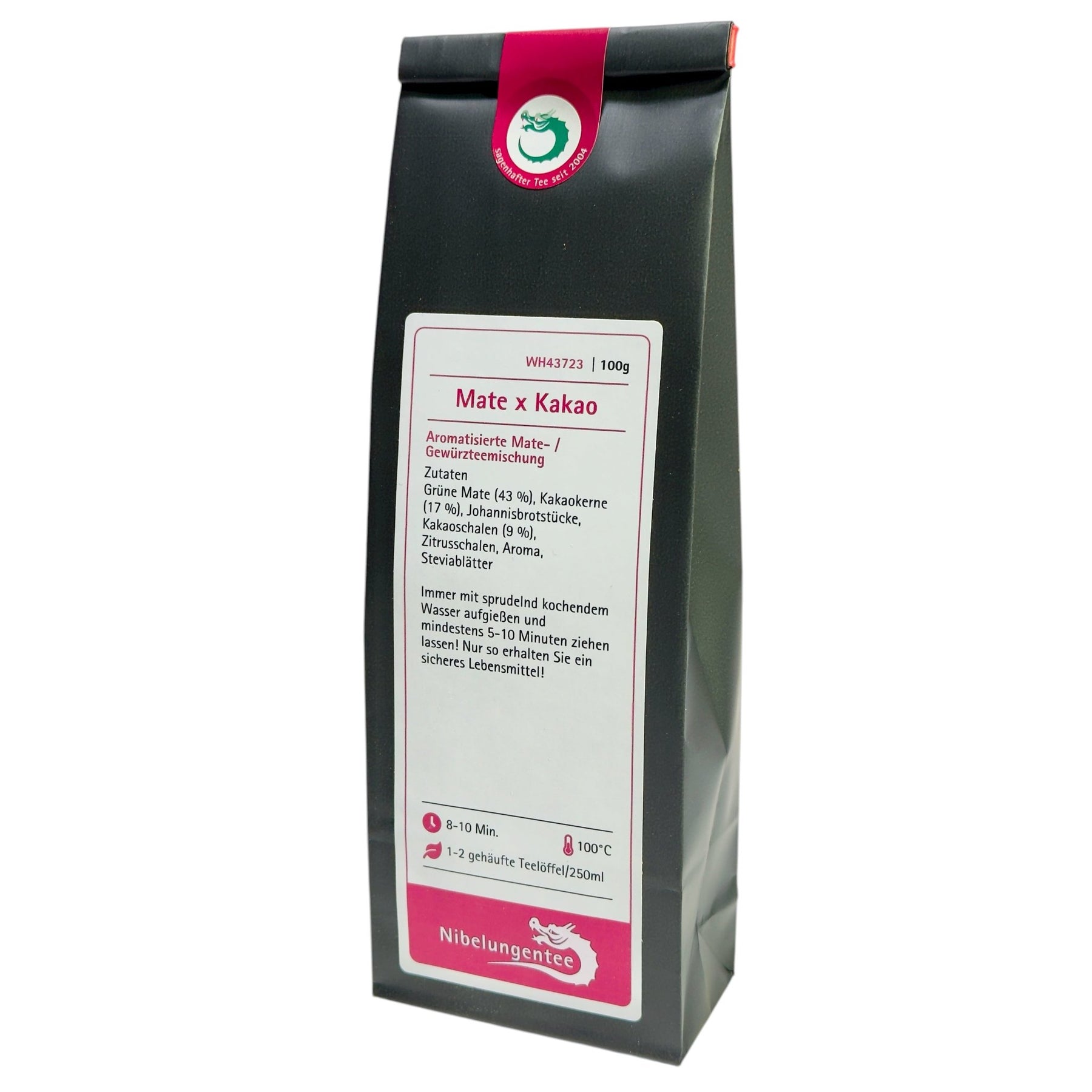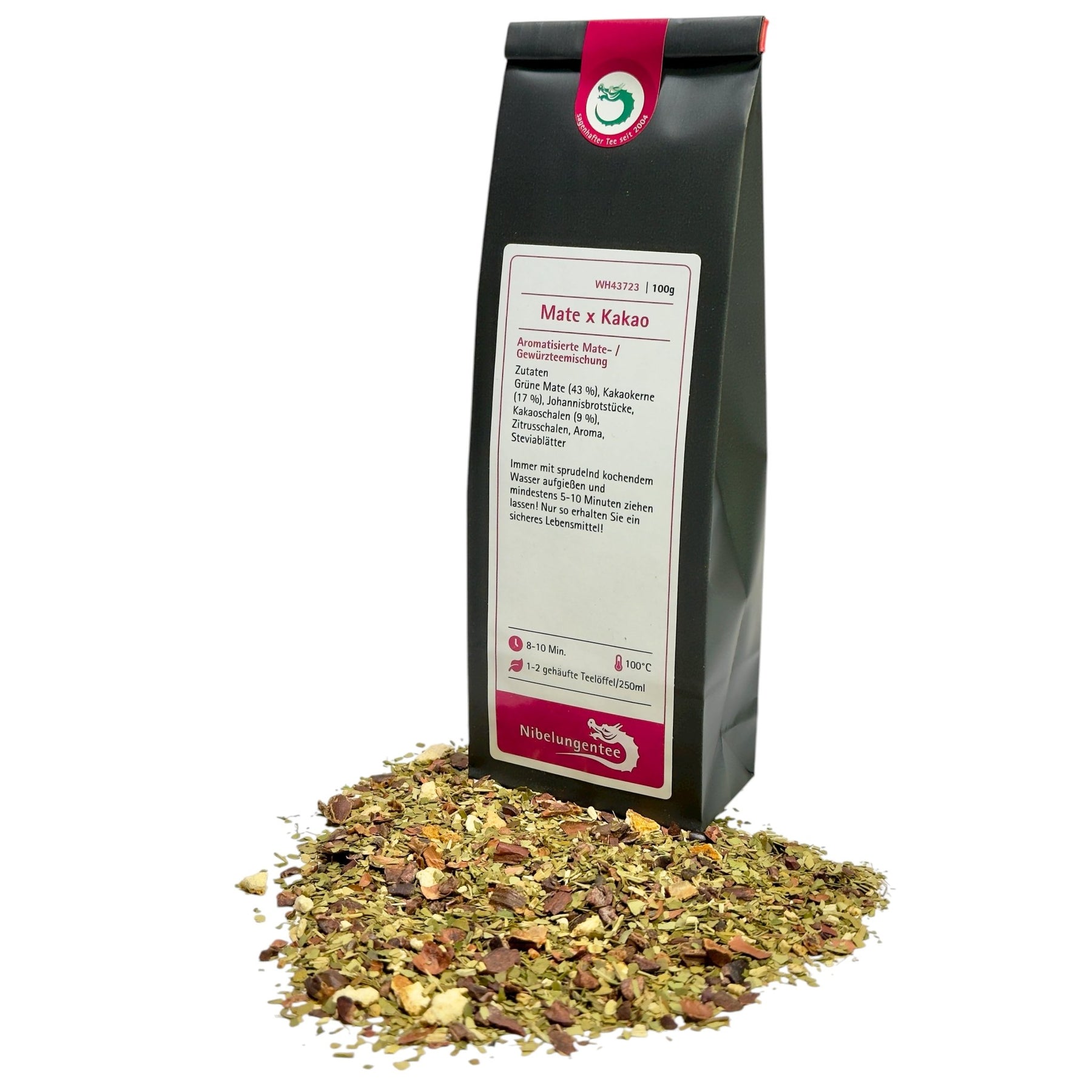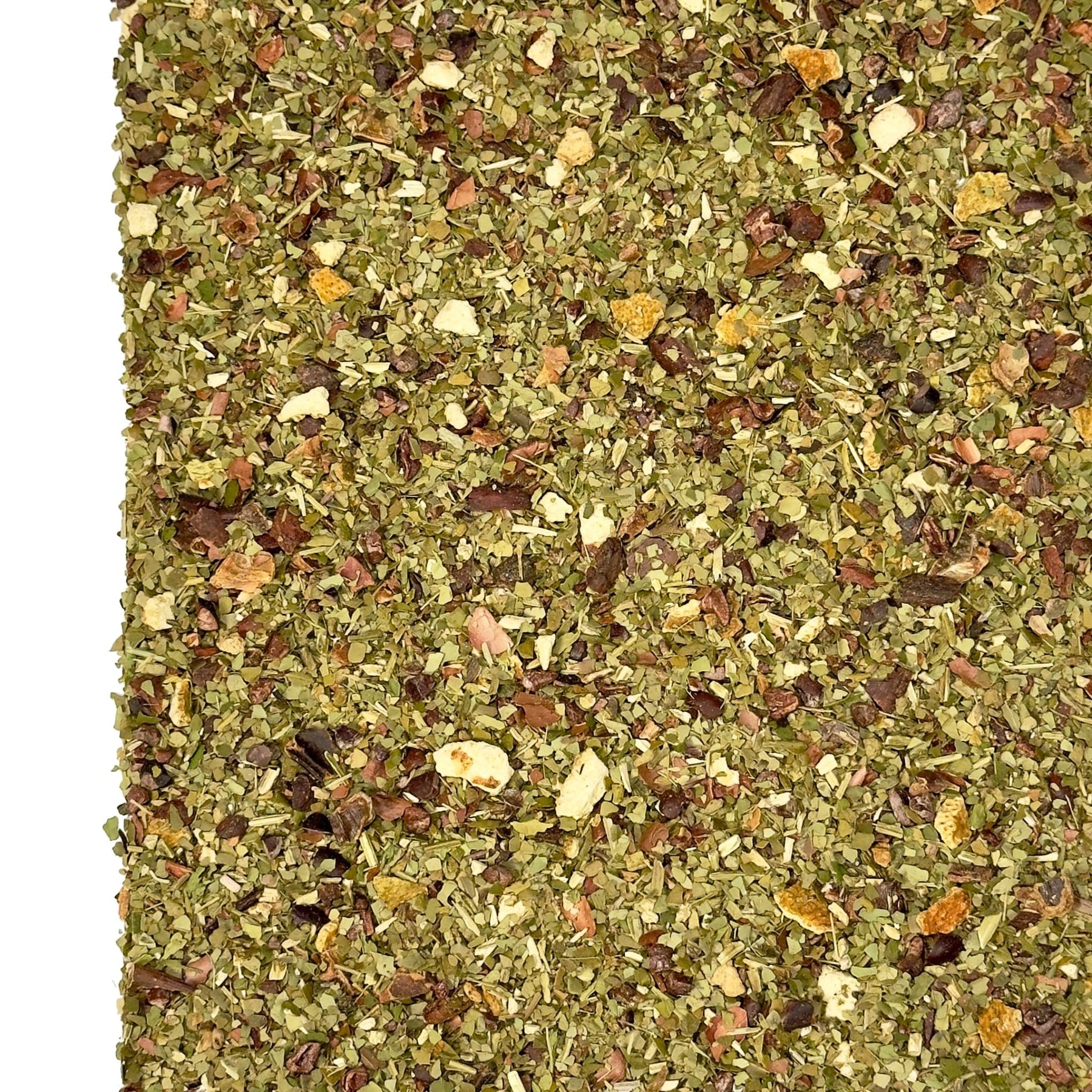 Zutaten: Grüne Mate (43 %), Kakaokerne (17 %), Johannisbrotstücke, Kakaoschalen (9 %), Zitrusschalen, Aroma, Steviablätter