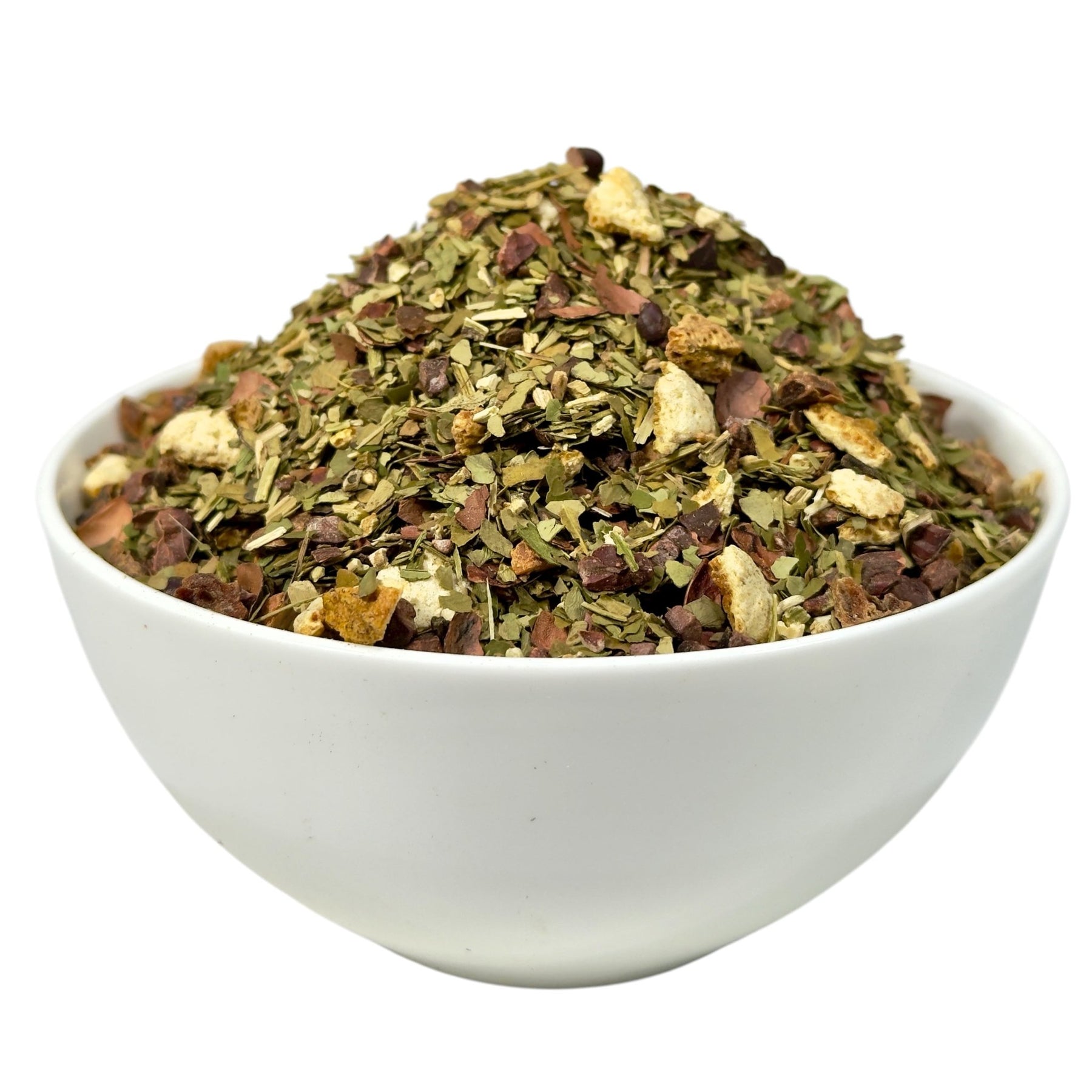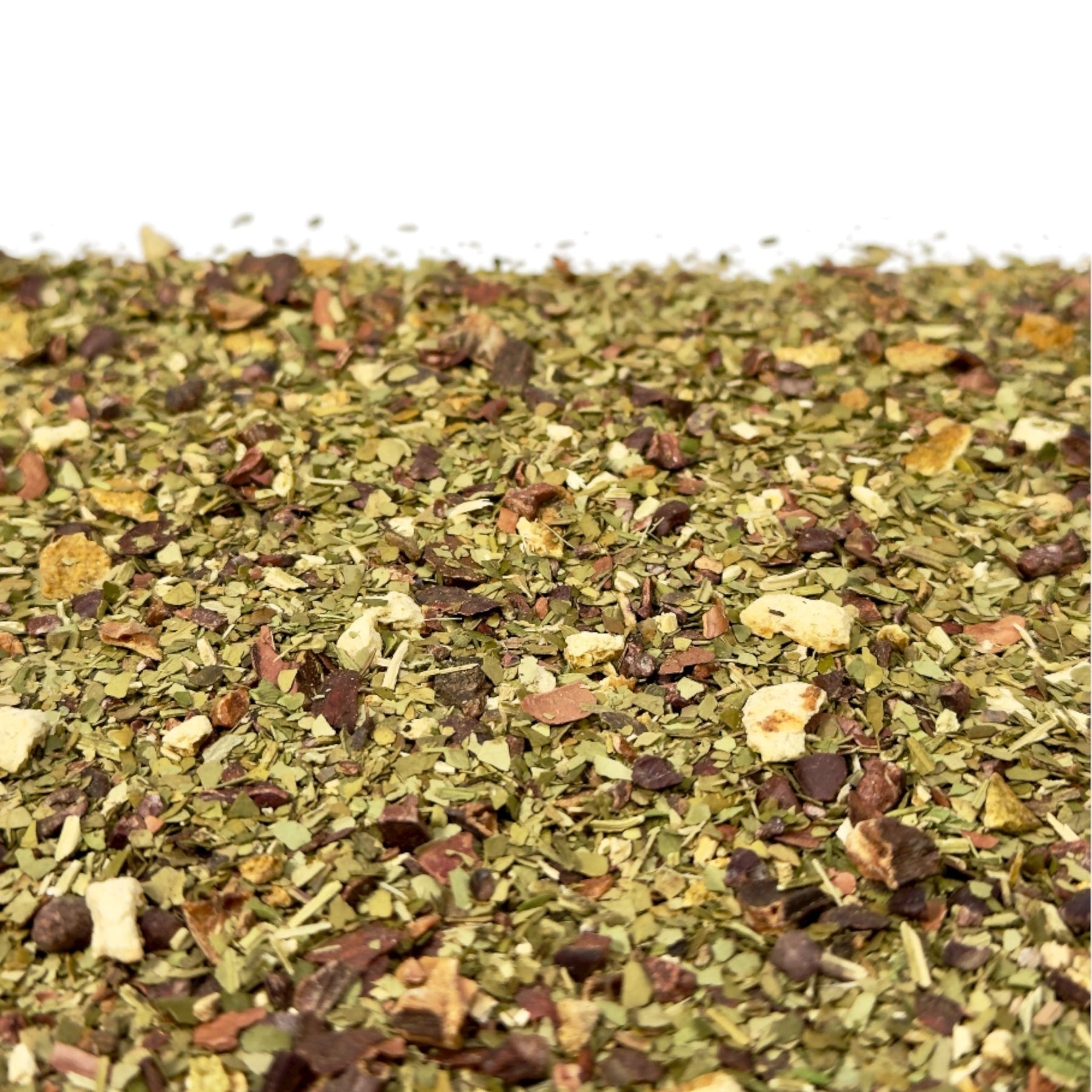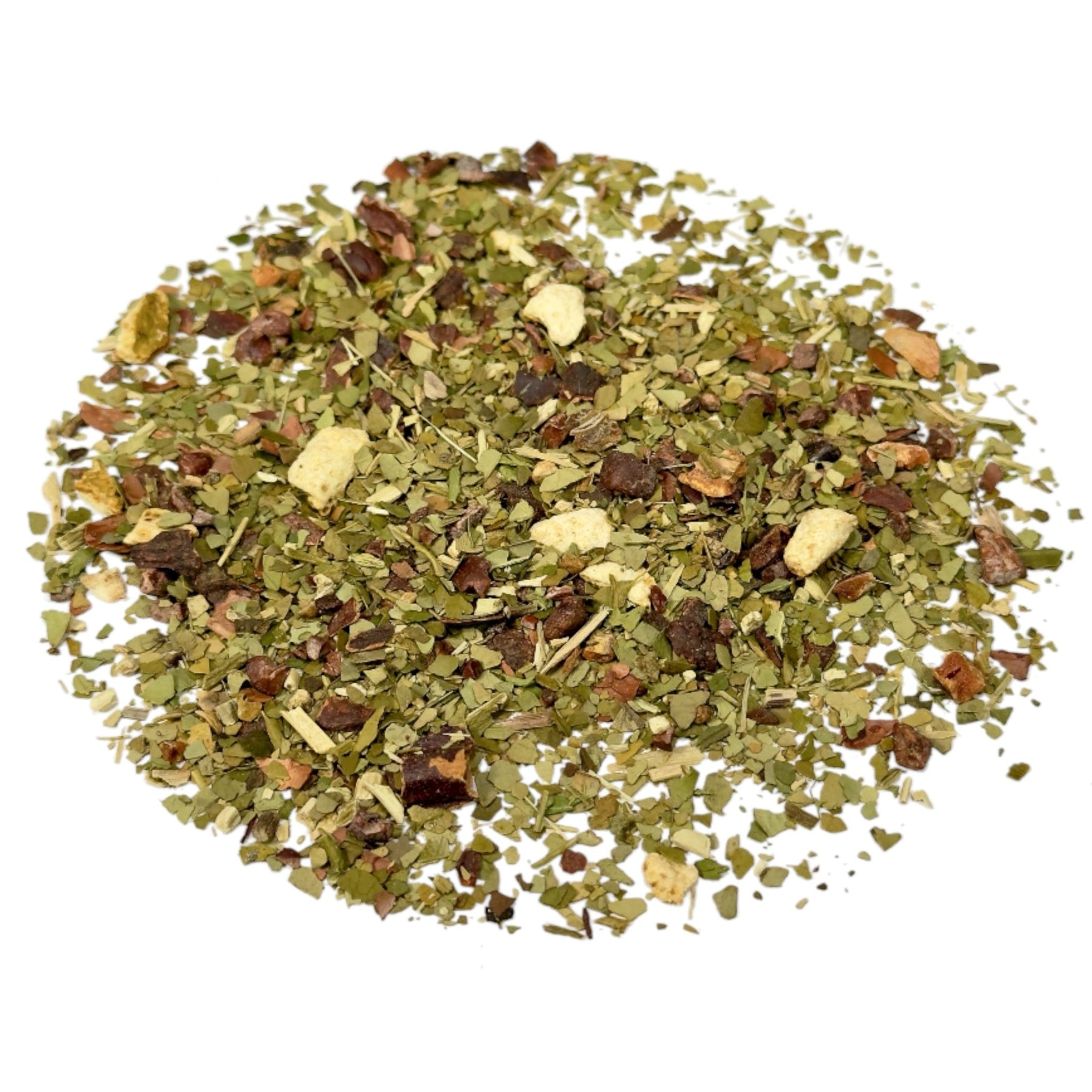 Zutaten: Grüne Mate (43 %), Kakaokerne (17 %), Johannisbrotstücke, Kakaoschalen (9 %), Zitrusschalen, Aroma, Steviablätter