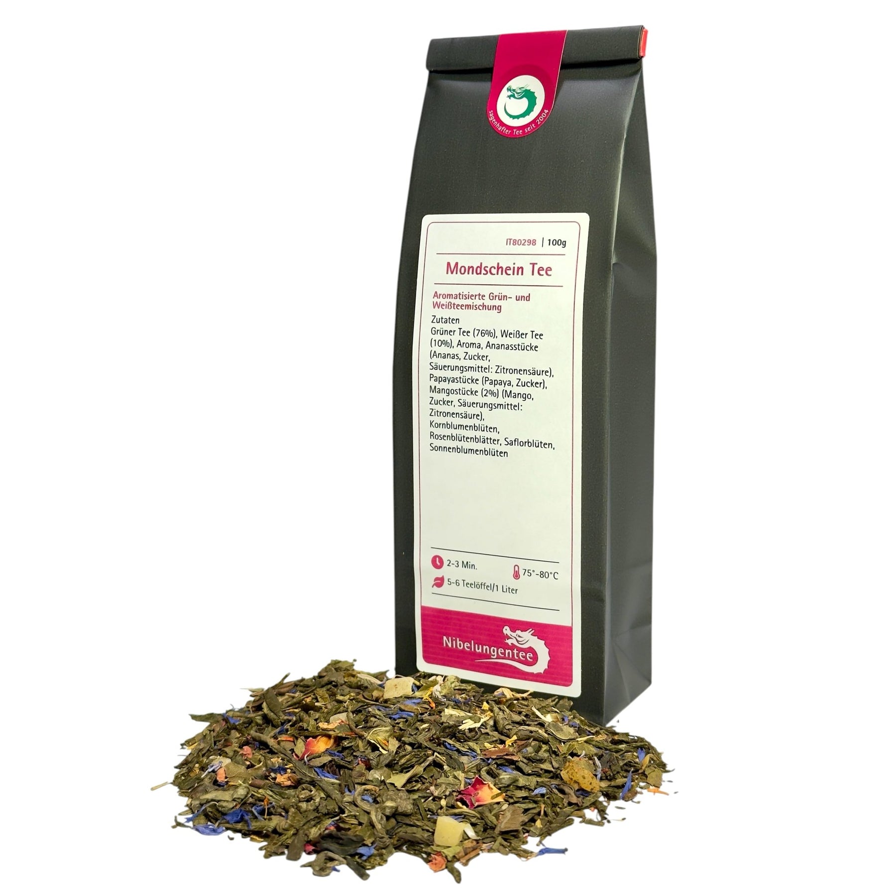 Der Mondschein Tee ist ein grüner Tee, der mit süßen Früchten verfeinert ist. Die Mischung besitzt einen gewissen Anteil an weißem Tee, welcher den Geschmack etwas abfedert. Die Basis ist somit sanfter als bei reinen grünen Teesorten und die einzelnen Komponenten kommen besser zur Geltung.