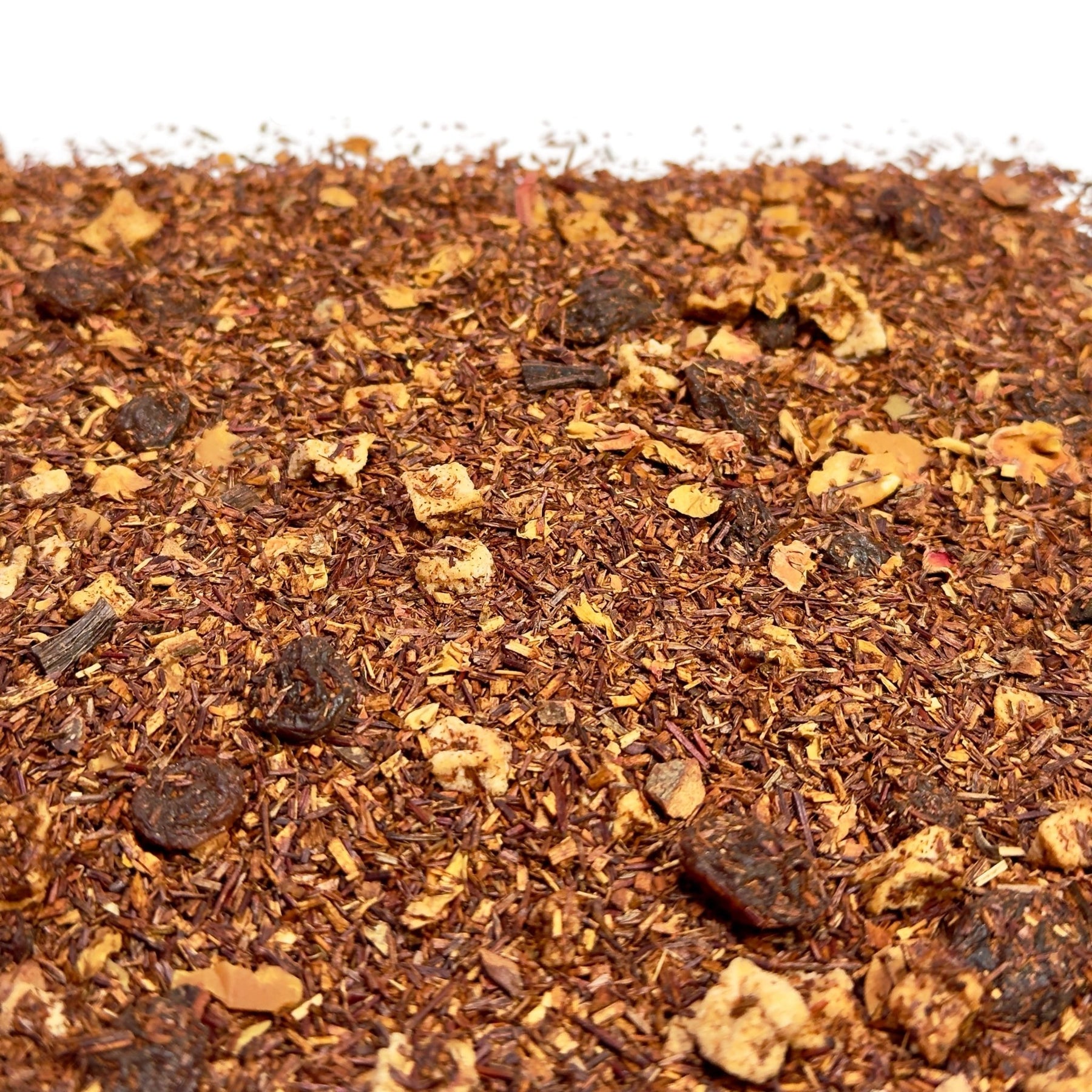 Wenn die Tage kürzer werden und der Regen kälter wird, freut man sich vor allem auf die Weihnachtszeit. Dieser Tee ist dafür die perfekte Einstimmung: Vor dem Hintergrund eines leichten Roibuschtees können hier Apfelstücke und weihnachtliche Aromen ihren süßen, leckeren Zauber entfalten.