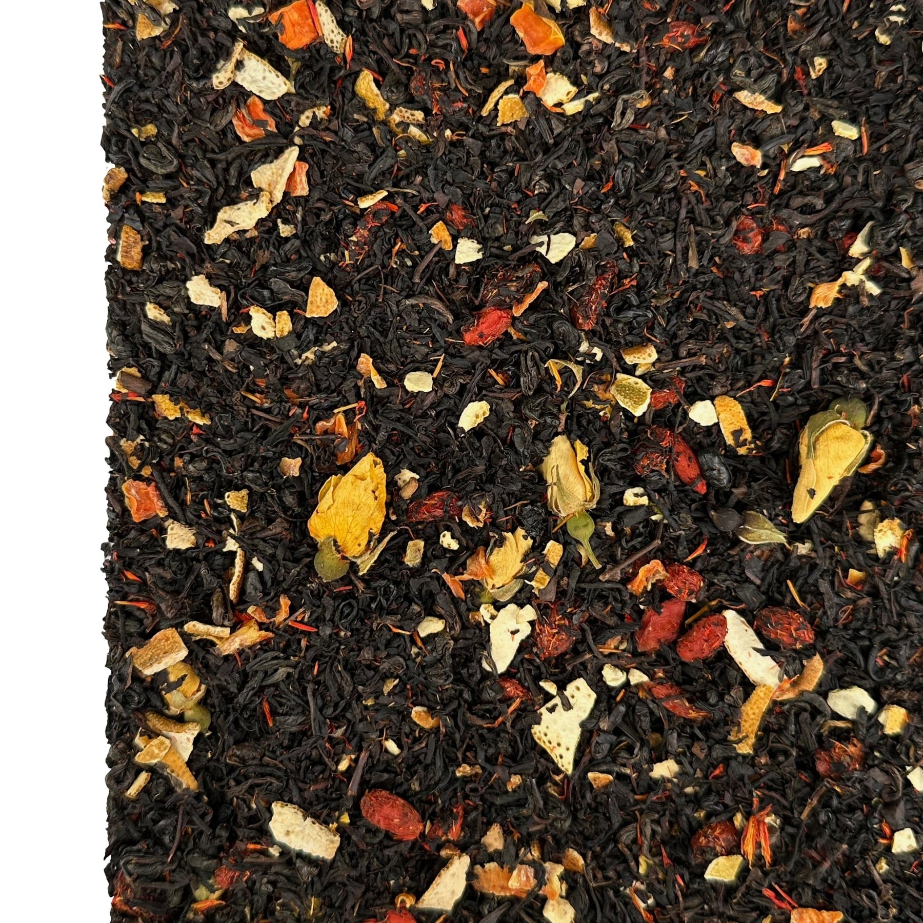 Zutaten: | schwarzer Tee (71 %), Orangenschalen, Gojibeeren, Aroma, Karottenflocken, gelbe Rosenknospen, Färberdisteln |