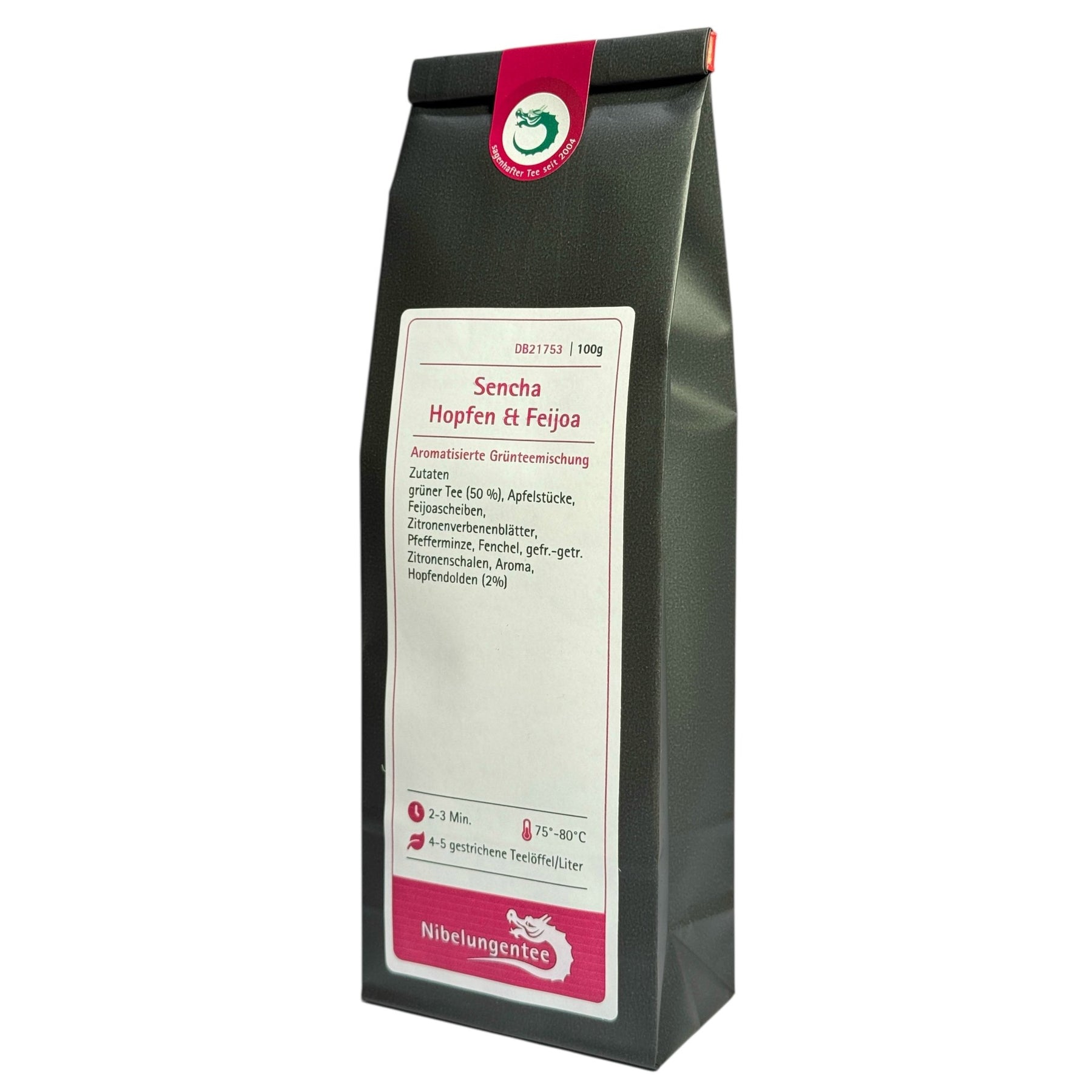 Nicht nur geschmacklich, sondern auch optisch hat diese Teemischung einiges zu bieten. Zwischen den zarten Grünteeblättern leuchten goldene Hopfendolden und getrocknete Feijoascheiben – ein echter Blickfang, der schon beim Öffnen der Packung Lust aufs Genießen macht. Der Duft, das Farbspiel, die Textur – alles fügt sich zu einem sinnlichen Erlebnis, das mehr ist als nur Tee.