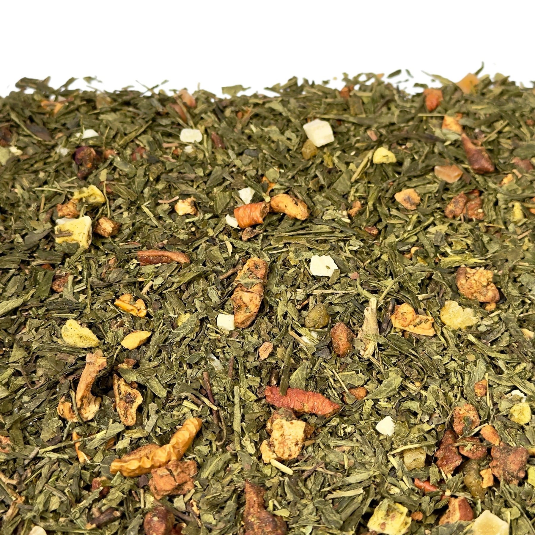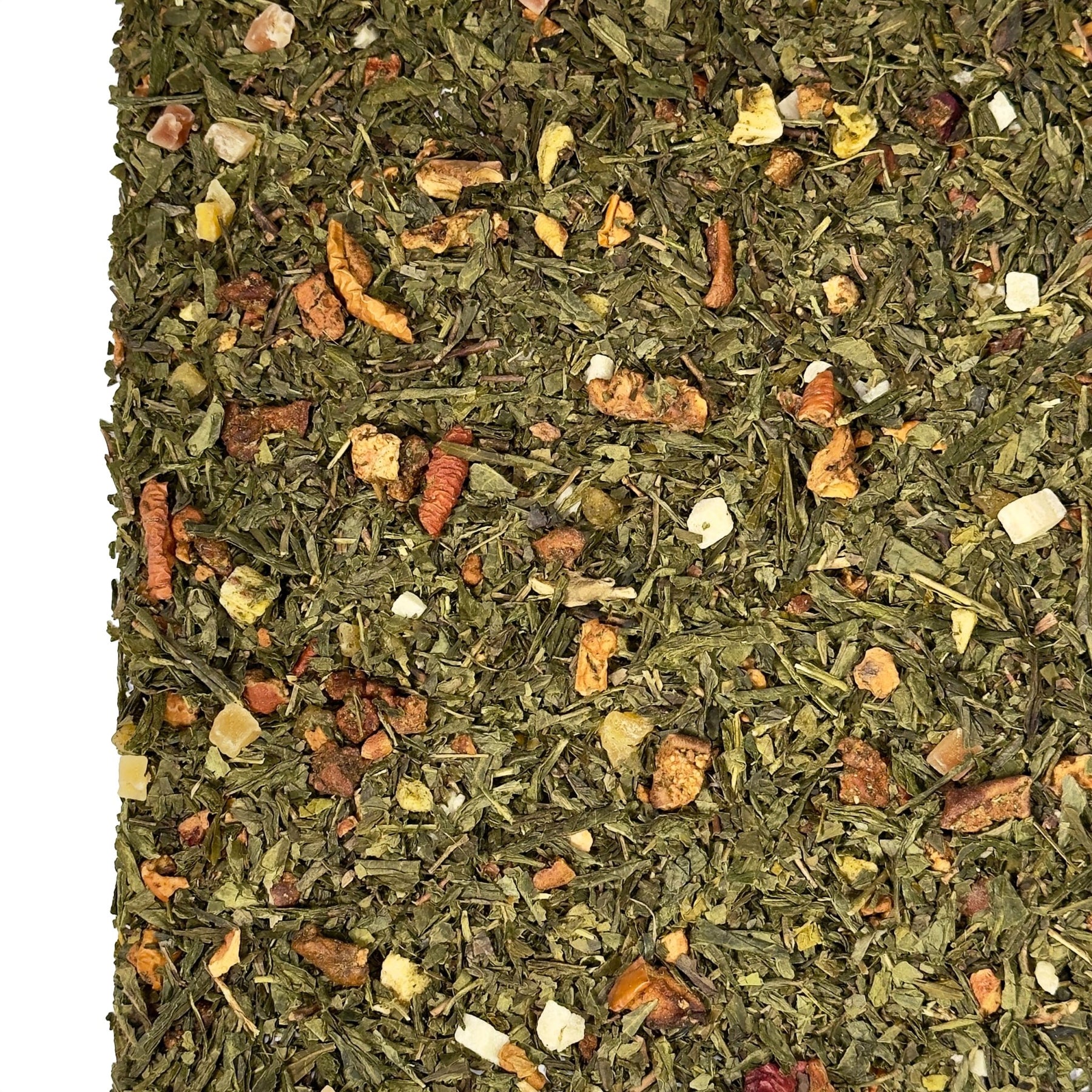 Der Charakter des Sencha bildet dabei das ruhige Fundament. Diese traditionelle Grünteesorte ist für ihr klares, leicht grasiges Aroma bekannt und bringt eine angenehme Frische in die Tasse. Gleichzeitig besitzt sie eine sanfte, zurückhaltende Herbe, die wunderbar mit fruchtigen Zutaten harmoniert und ihnen Raum lässt, sich zu entfalten.