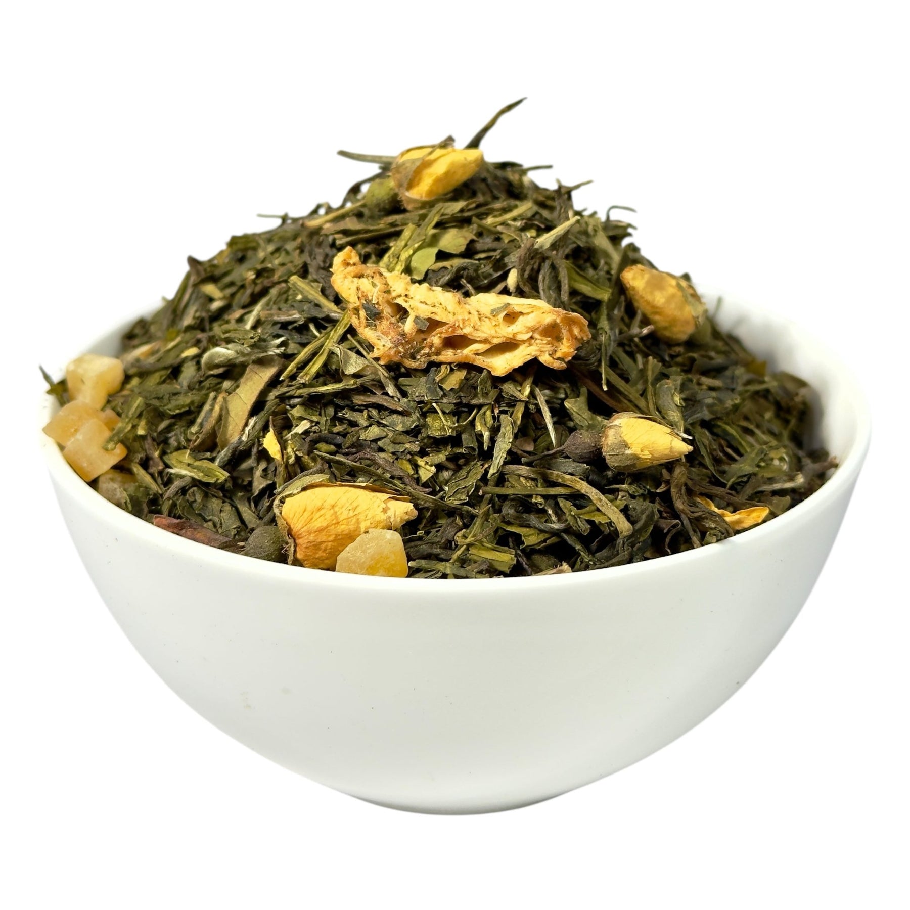 Zwischen den edlen Teesorten blitzen immer wieder kleine Highlights auf, die neugierig machen. Gelbe Rosenknospen setzen elegante, florale Akzente und unterstreichen den hochwertigen Charakter der Mischung. Sie wirken nie aufdringlich, sondern fügen sich sanft ein und sorgen für eine feine, frische Leichtigkeit, die wunderbar mit den Tees harmoniert.