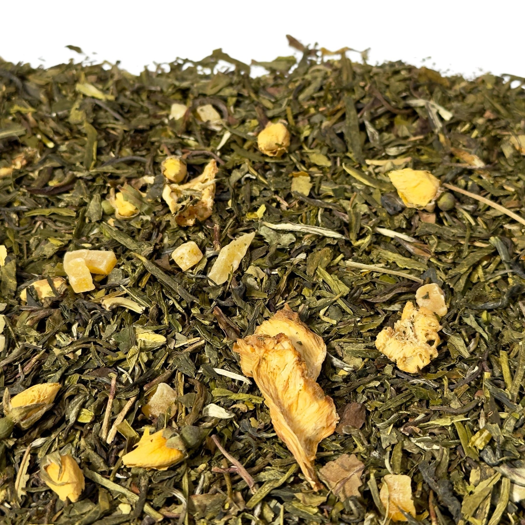 Fruchtige Elemente wie Ananas und Mango bringen eine sonnige, exotische Note ins Spiel. Sie erinnern an reife Früchte und warme Tage, ohne den Tee zu dominieren. Besonders die Mango – als echte Superfruit bekannt – verleiht der Mischung einen cremig-süßen Hauch, der zusammen mit einem zarten Anklang saftiger Birne für ein rundes und ausgewogenes Geschmackserlebnis sorgt.